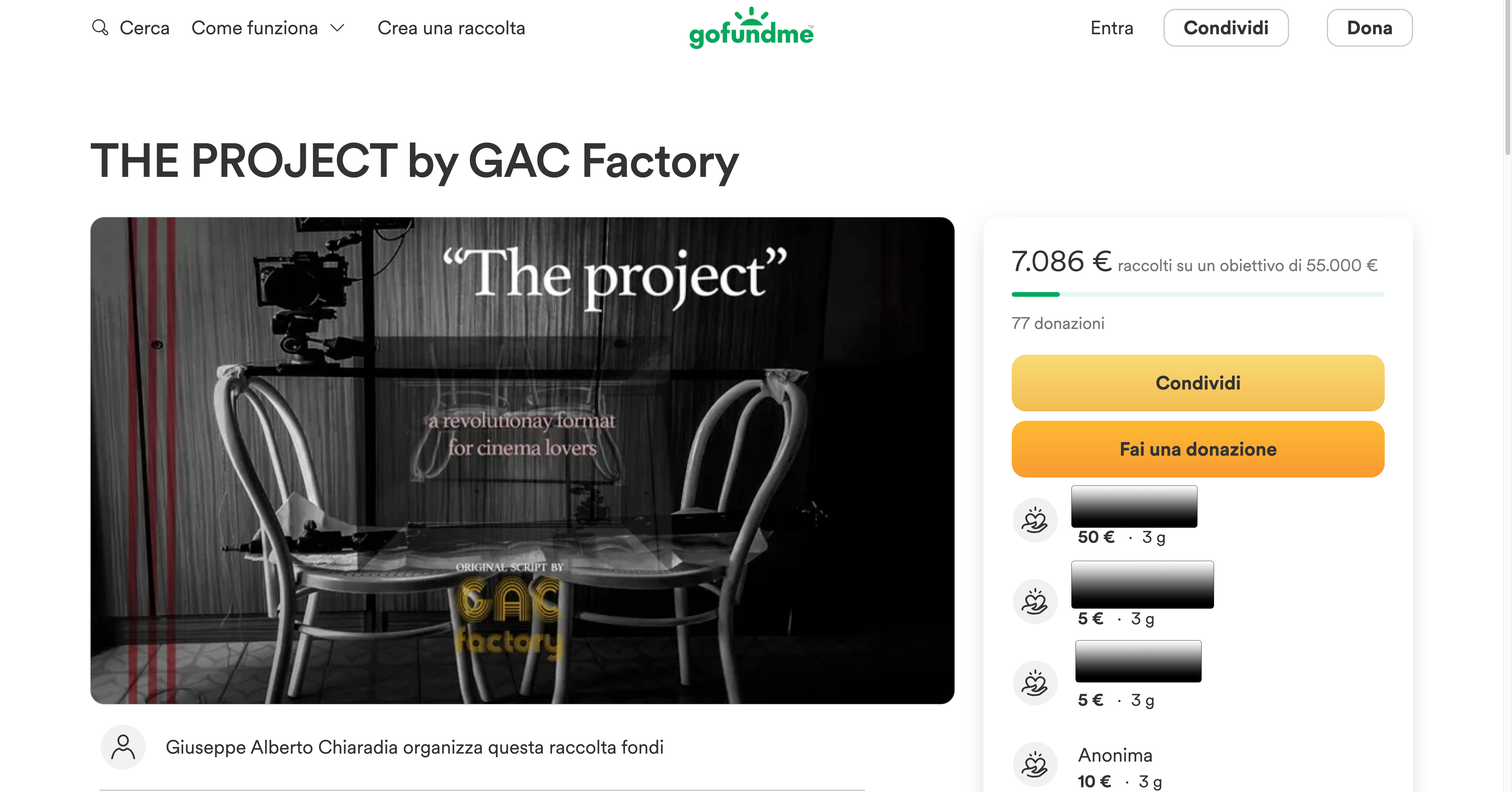 2️⃣Effettuare una donazione “consigliata” di 15 euro sulla nostra pagina di GOFUNDME “The project by GACFACTORY”