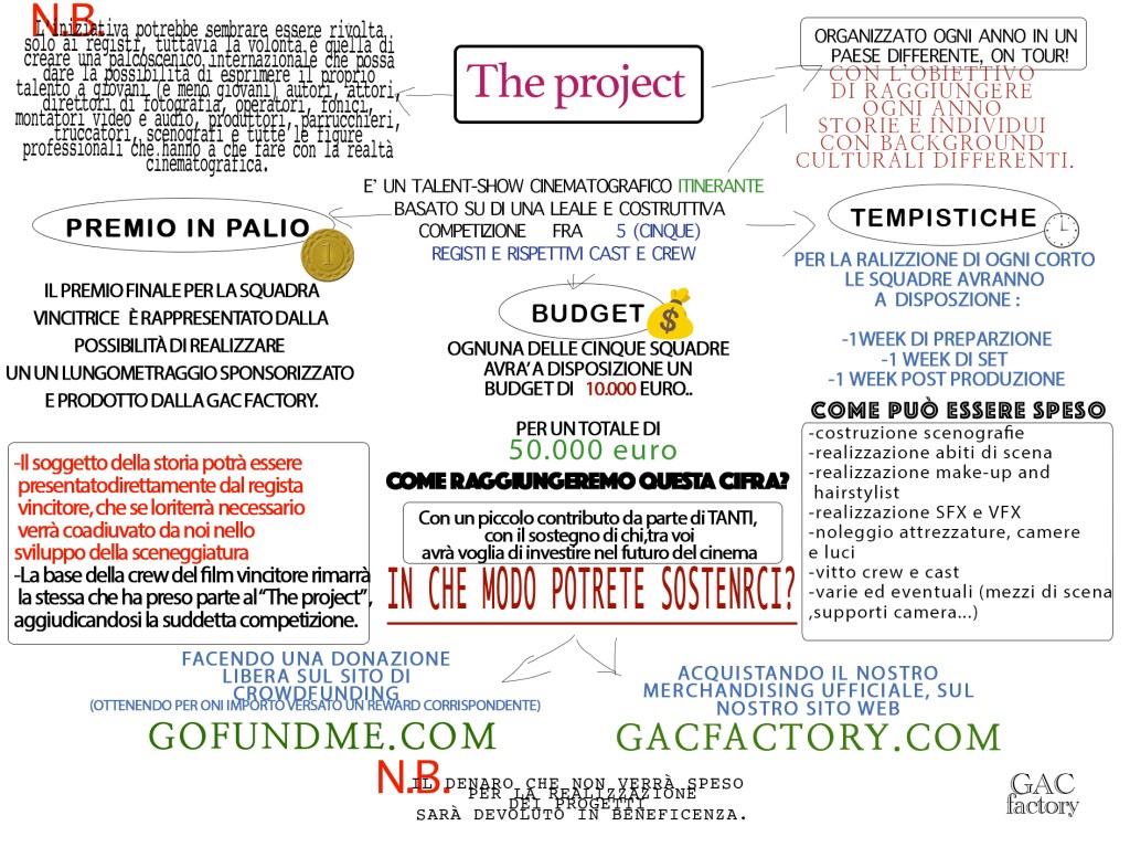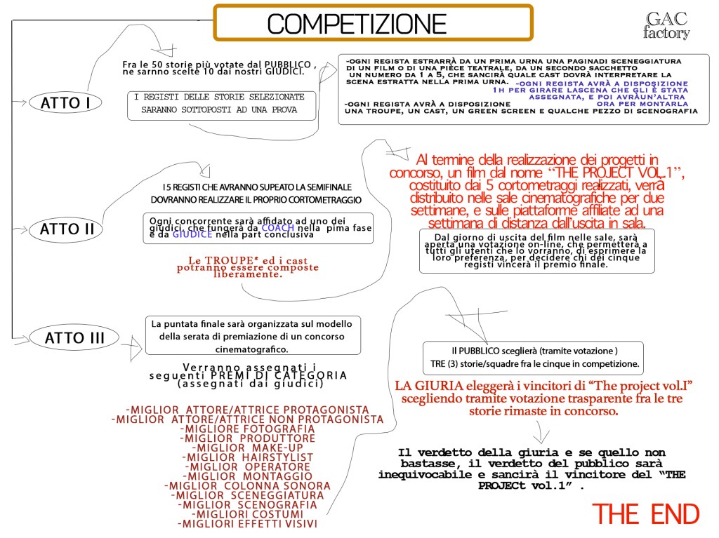 1. “The project” è un format web-televisivo itinerante basato su di una leale e costruttiva competizione fra cinque registi e rispettivi cast e crew. Fra i registi finalisti, tre saranno obbligatoriamente UNDER-35, mentre per gli altri due posti, per la crew e per il cast non saranno previsti limiti di età. Il premio in palio è la realizzazione di un film ad opera del regista, del cast e della troupe del progetto che si aggiudicherà la vittoria della competizione.
